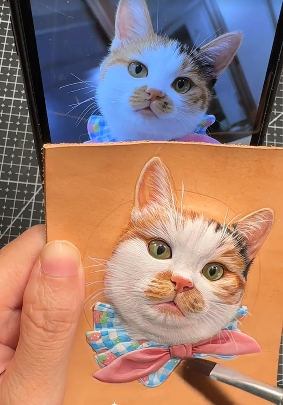 ▸ Our creation: It begins by listening to your story. The inheritor then spends days sculpting the leather layer by layer—carving, shaping, and crafting light and shadow with a sculptor’s vision. The fluff of the fur, the moist glow of the nose, the sparkle in the eyes—all become tangible. This is not just a portrait; it is a touchable, three-dimensional memory. With over ten years of mastery, what emerges from the artisan’s hands is not merely an image, but a sense of life leaping off the leather—more dimensional, more precise in gradient, more vivid in gaze.